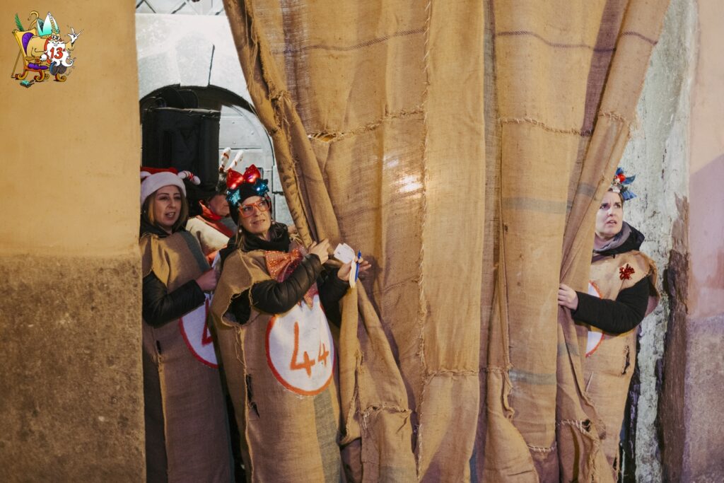I 90 Numeri Viventi, dopo aver sfilato in corteo lungo le vie del borgo ed essere arrivati in piazza sul Cartellone, si infilano nella Sacchetta, un vicolo del centro storico che sfocia nella piazza (Via delle Prigioni Vecchie). Qui attendono di essere – chissà – estratti.